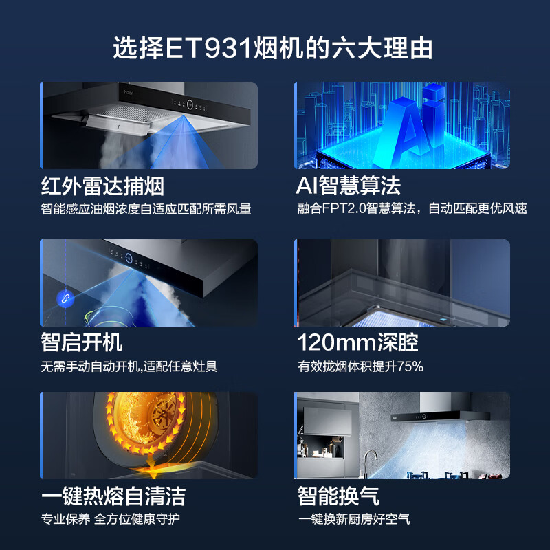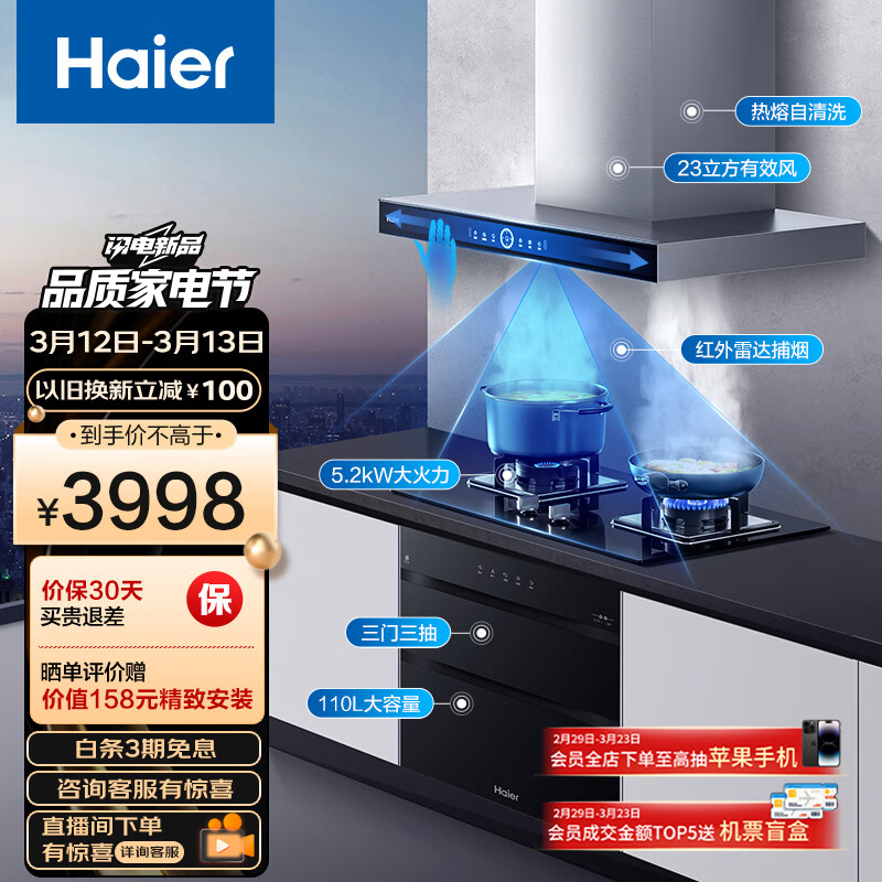 海尔(Haier)抽油烟机 顶吸烟灶消三件套 23m3/min有效风 5.2kw大火力 110L三抽消毒柜ET931+Q2BE3(天)+EB031价格:3998.00元!