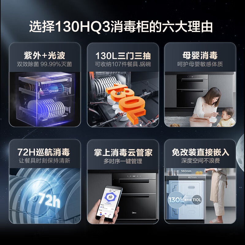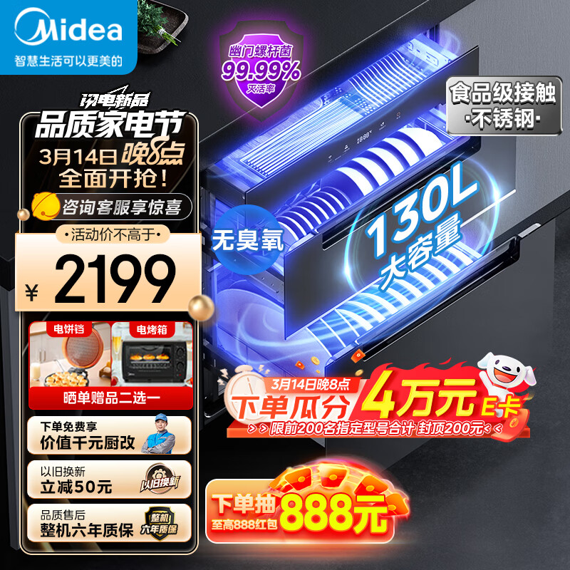 美的(Midea)消毒柜家用 嵌入式 厨房餐具碗柜碗筷茶杯茶具 紫外线 二星 婴儿奶瓶 130L三层大容量130HQ3价格:2399.00元!