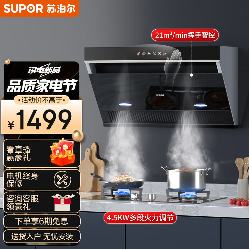 苏泊尔(SUPOR) 抽油烟机 侧吸式烟机灶具套装21立方 家用吸油烟机4.5kW爆炒燃气灶烟灶套装C5+DB19天价格:1599.00元!