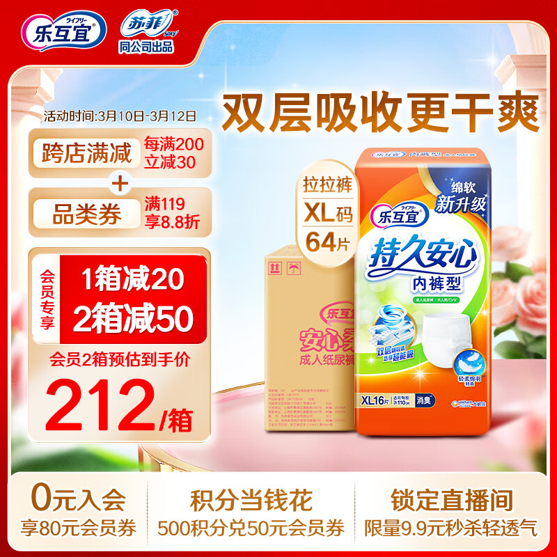 乐互宜持久安心成人拉拉裤老年人长效吸收加大加厚尿不湿XL码64片价格:320.00元!
