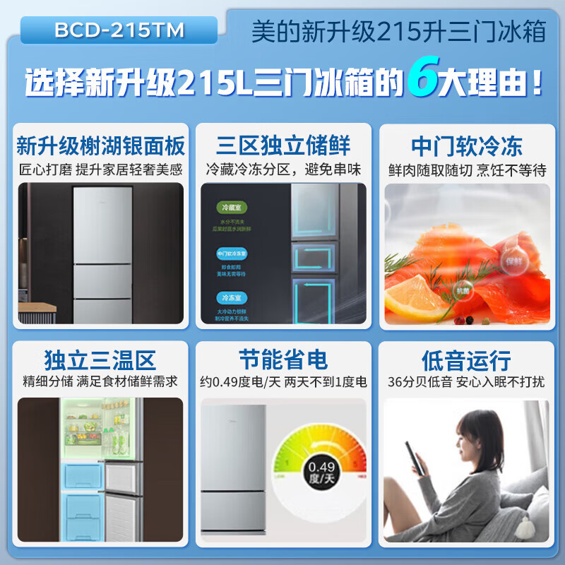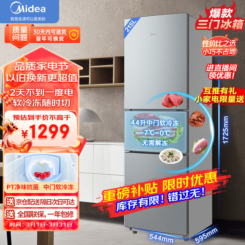 美的(Midea)冰箱215升大容量三门三温家用线下同款小冰箱宿舍节能低音净味除菌中门软冷冻保鲜以旧换新电冰箱 【215升三门软冷冻随时切】 BCD-215TM价格:1248.00元!