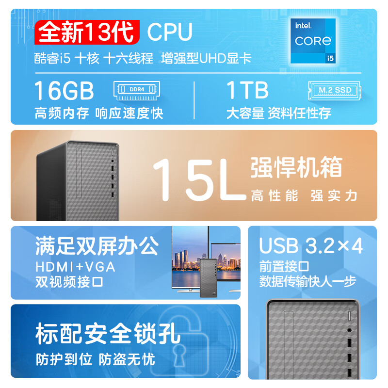 惠普HP 星Box商务办公台式电脑主机15L(13代酷睿i5-13400 16G 1TB固态硬盘 注册五年上门)+21.45英寸价格:3899.00元!