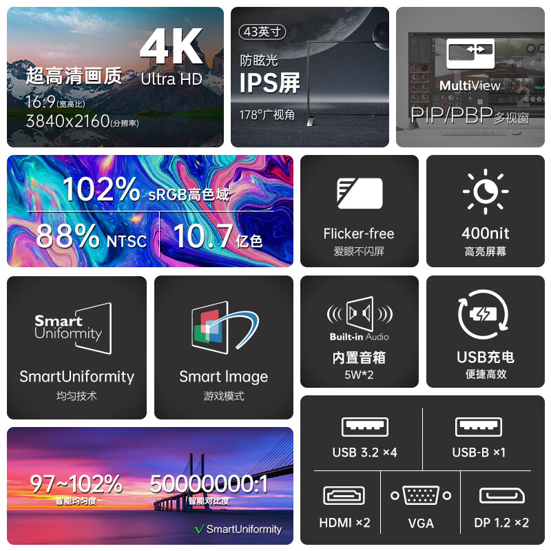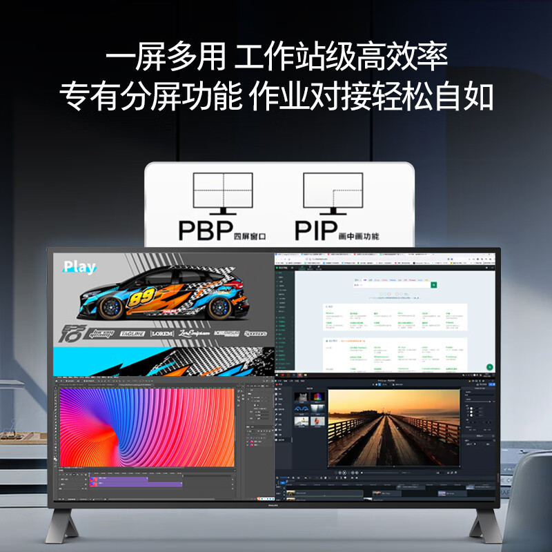 飞利浦(PHILIPS)43英寸办公显示器 4K超清 IPS屏 10bit PBP多视窗 内置音箱 HDMI+DP+VGA 设计电脑显示屏 438P1价格:2999.00元!