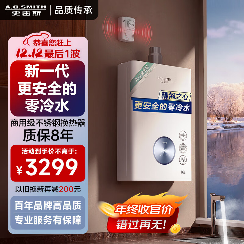 史密斯(A.O.SMITH)佳尼特16升零冷水燃气热水器 不锈钢换热器包8年 负压更 恒温大水量 JSQ31-TJ1 以旧换新价格:3299.00元!