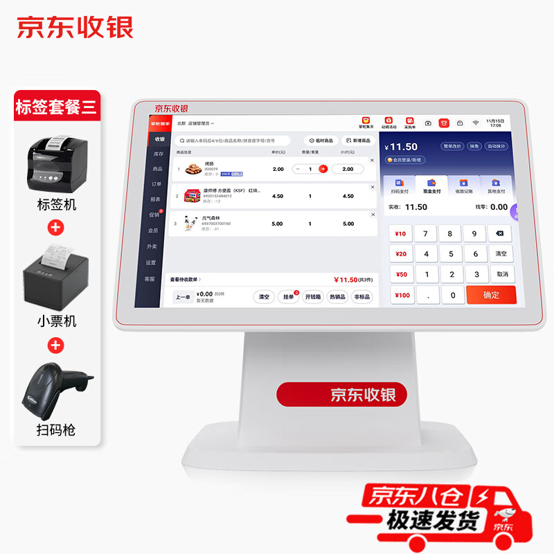 京东收银 京东支付收银机一体机超市零售便利店收款机称重收银系统软件餐饮扫码点餐 收银机+扫码枪+小票机+标签机+收银软件价格:2386.00元!