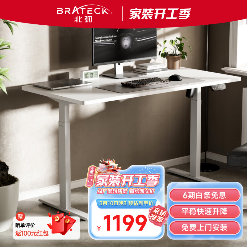 Brateck电动升降电脑桌 北弧站立办公升降书桌 工作升降台 K2白1.5米价格:1399.00元!