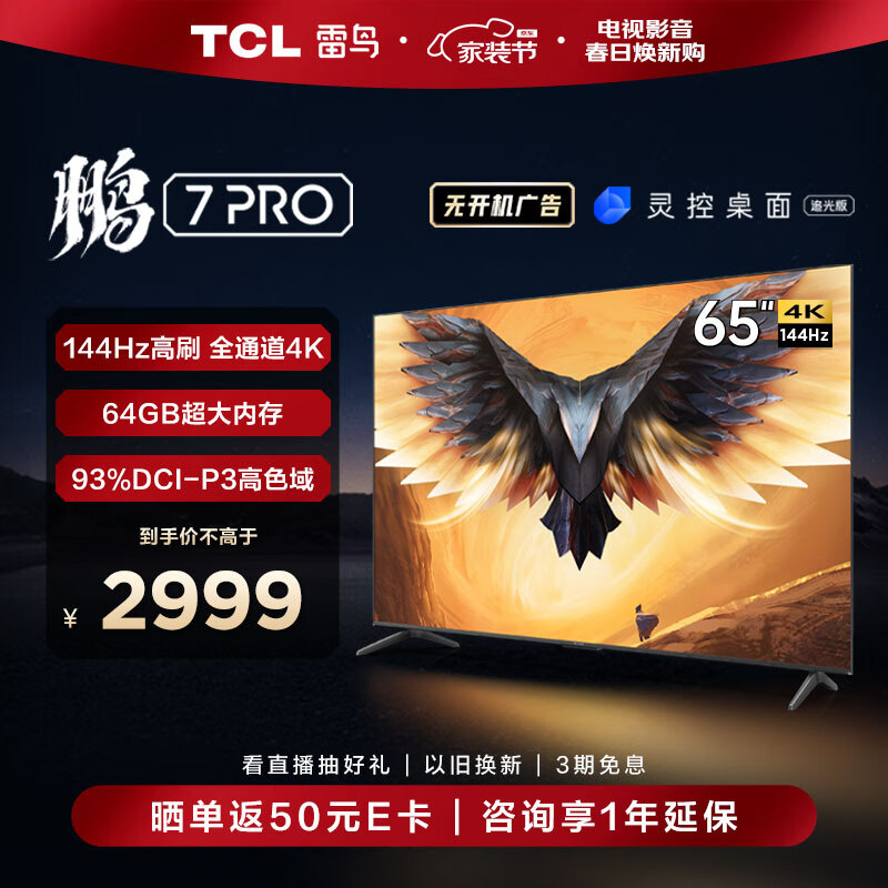 TCL雷鸟 鹏7PRO 65英寸游戏电视 144Hz高刷 HDMI2.1 4K超高清 3+64GB 超薄液晶平板电视机65S575C价格:2999.00元!