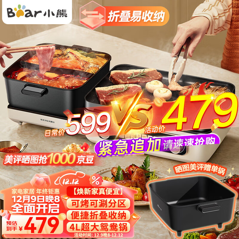 小熊(Bear)折叠多功能料理锅 电火锅 鸳鸯锅 火锅专用锅烤涮一体锅家用轻烟烤肉锅火锅烧烤DKL-E22W1价格:479.00元!