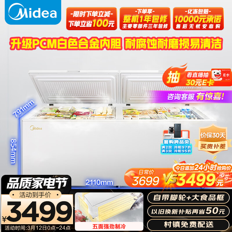 美的(Midea)719升 双顶开商用囤货大冰柜 五面制冷冷冻冷藏转换冷柜 卧式冰箱 BD/BC-719DKM(E) 以旧换新价格:3599.00元!