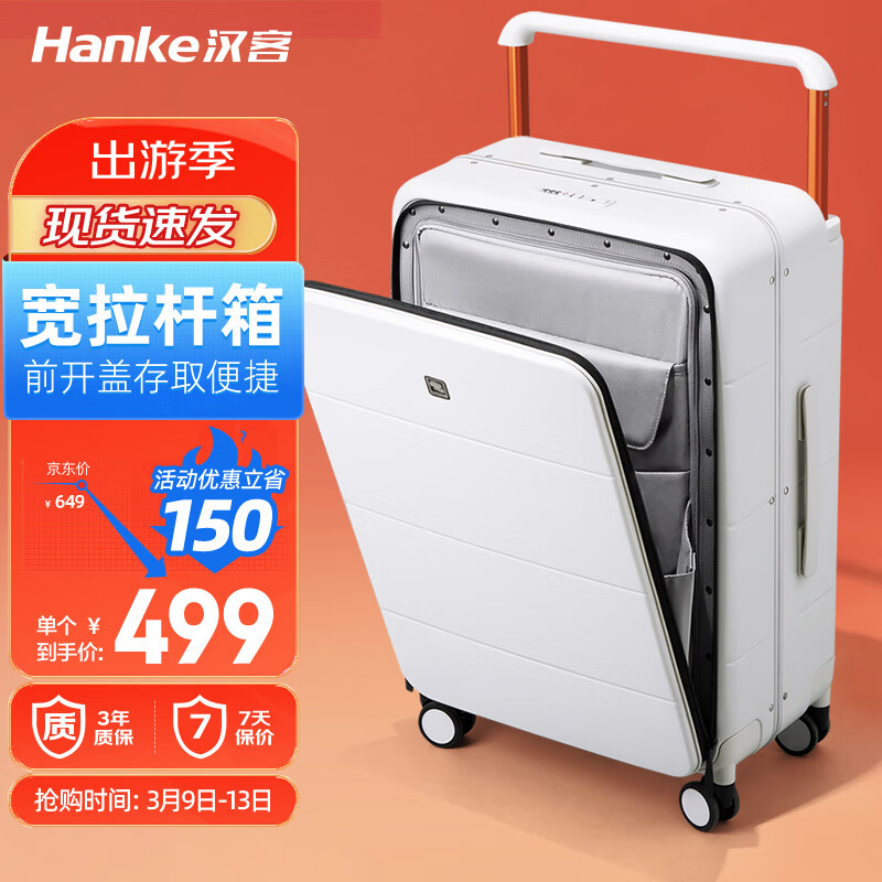 汉客宽拉杆行李箱铝框男前开盖拉杆箱女旅行箱20英寸烟白色登机密码箱价格:649.00元!