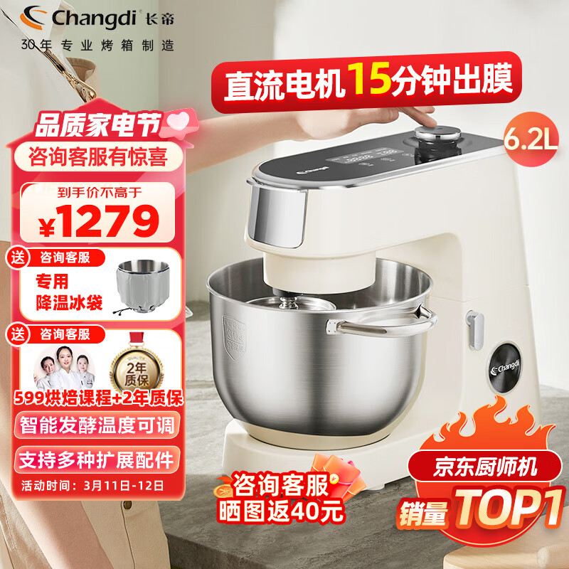 长帝(changdi)家用多功能和面机厨师机 6.2L大容量 顶部大屏触控 直流轻音揉面机面条机 自动发酵 企鹅顶顶价格:1279.00元!