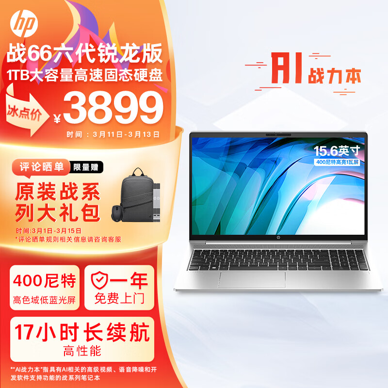 惠普(HP)战66六代 锐龙版15.6英寸轻薄笔记本电脑(锐龙高性能R5 32G 1TB 长续航 高色域低蓝光 AI新体验)价格:3899.00元!