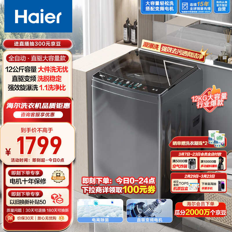 海尔(Haier)波轮洗衣机全自动 12公斤大容量 漩瀑洗高洁净 直驱变频 电离除菌 羽绒洗 以旧换新EB120B35Mate3价格:1899.00元!