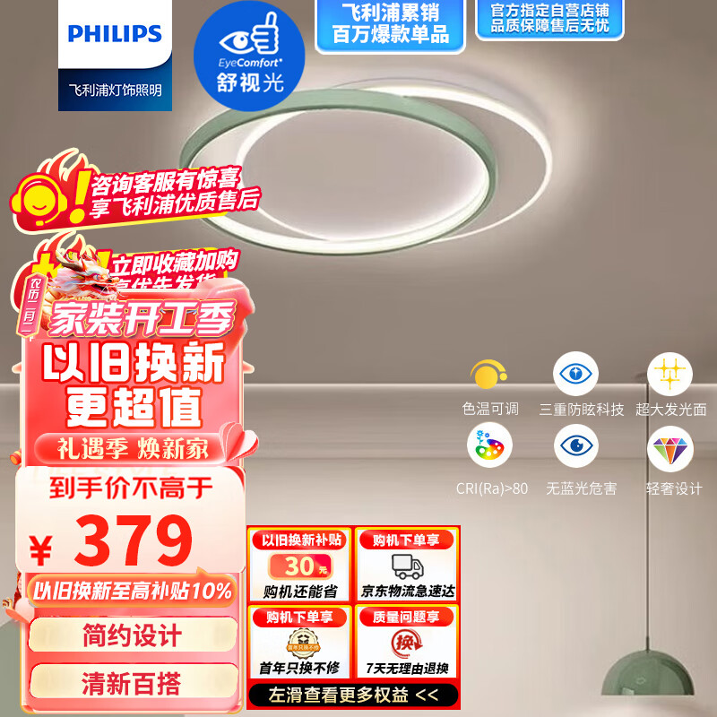 飞利浦(PHILIPS)全光谱LED吸顶灯卧室灯客厅灯书房儿童房灯饰灯具环慕45W罗勒绿价格:579.00元!