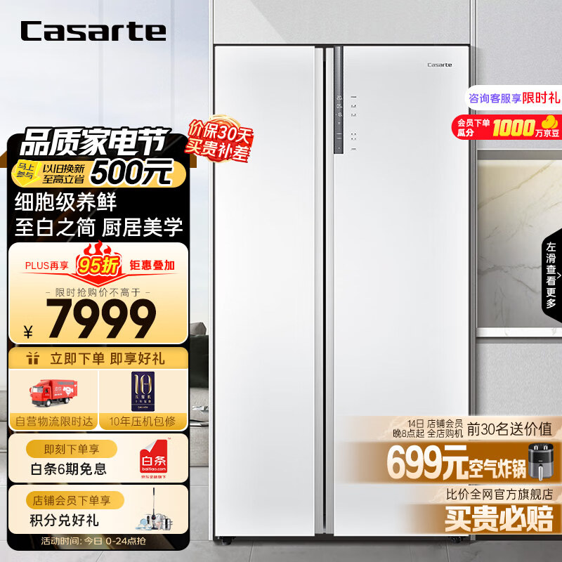 卡萨帝(Casarte)643升纯白系列大容量对开门双开门家用嵌入式电冰箱一级变频玻璃面板白色BCD-643WLCSS79W1U1价格:7999.00元!