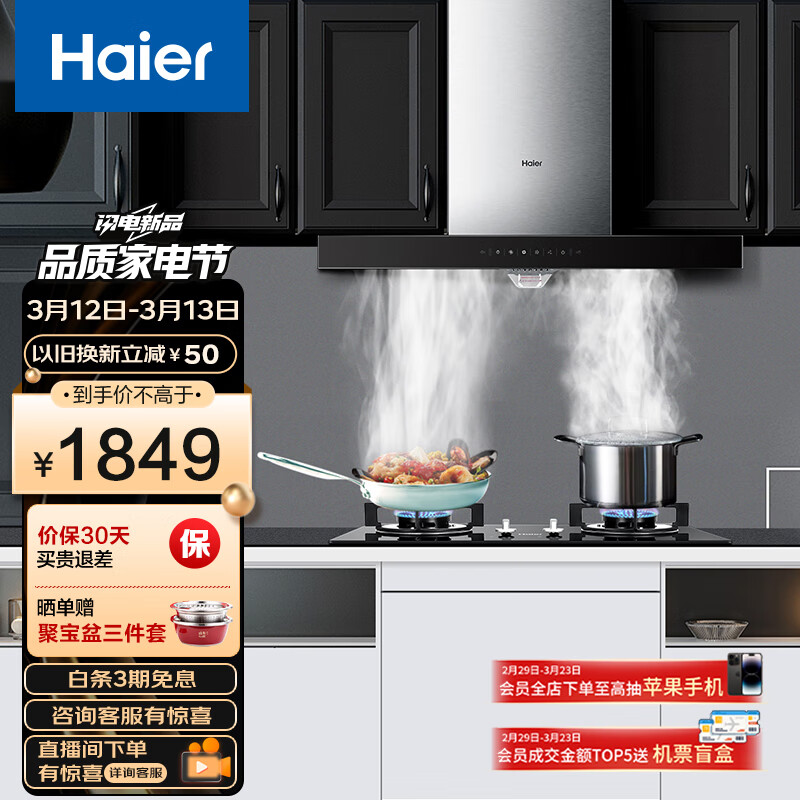 海尔(Haier)抽油烟机 烟灶套装 21m3/min大吸力 挥手智控自旋洗 欧式家用吸油烟机燃气灶 T11+Q2BE2(天)价格:1849.00元!