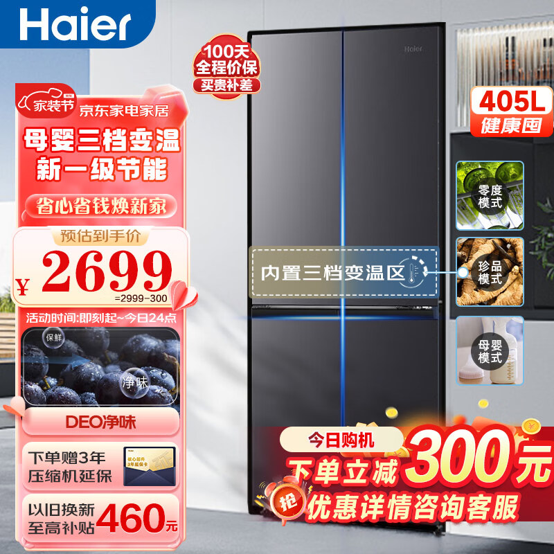 海尔(Haier)鲜派系列 变频节能新一级家用405升十字对开门多门四门母婴冰箱风冷无霜电冰箱BCD-405WLHTDEDS9U1价格:2699.00元!