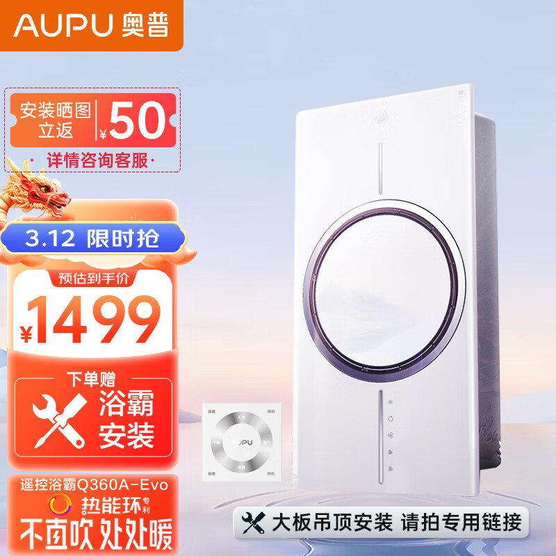 奥普(AUPU)浴霸Q360A-Evo热能环风暖浴霸遥控开关外接照明(非大板安装SKU)价格:1699.00元!