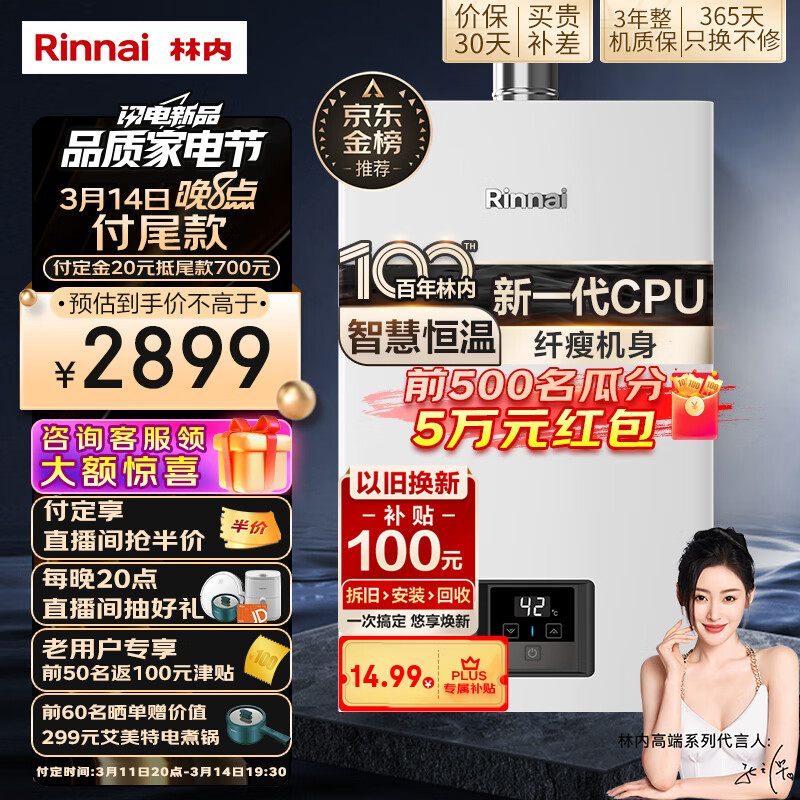 林内(Rinnai)16升燃气热水器 智慧恒温 全新升级CPU 黄金窄比 恒温系列RUS-16GD31(JSQ31-GD31)价格:2899.00元!