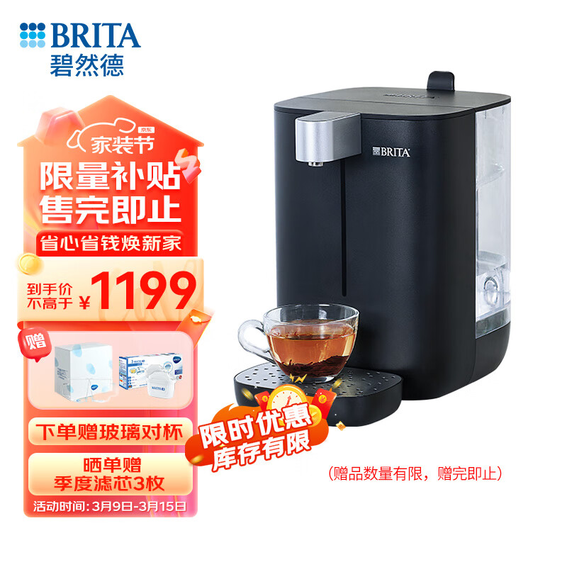 碧然德(BRITA) 台面净饮机即热直饮调温免安装台式净水器 黑色 智能即热饮水机价格:1199.00元!