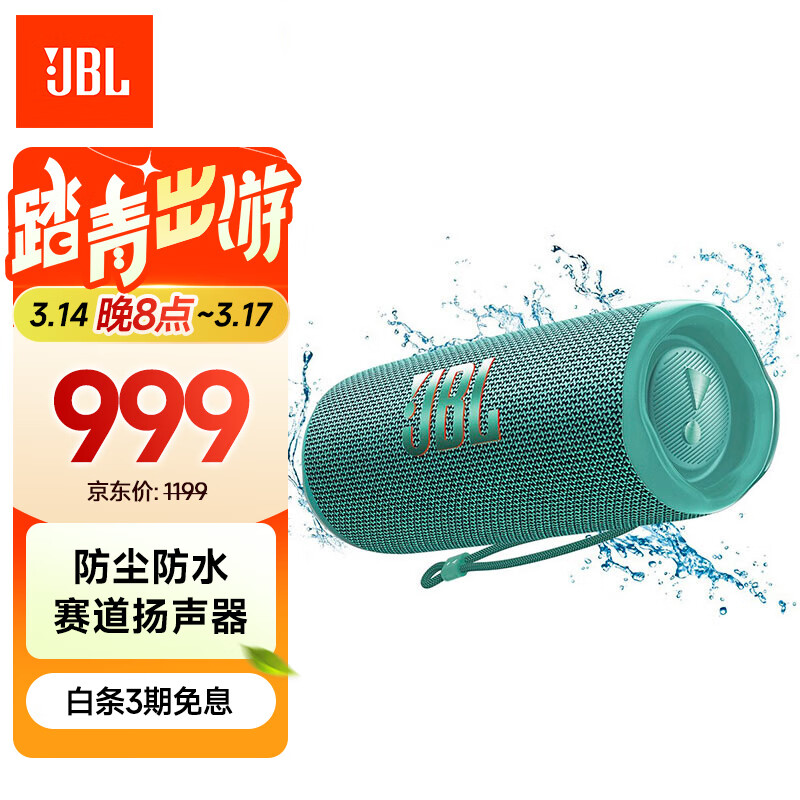 JBL FLIP6 音乐万花筒六代 便携蓝牙音箱 防水防尘 赛道扬声器 独立高音单元 湖翠绿价格:1199.00元!