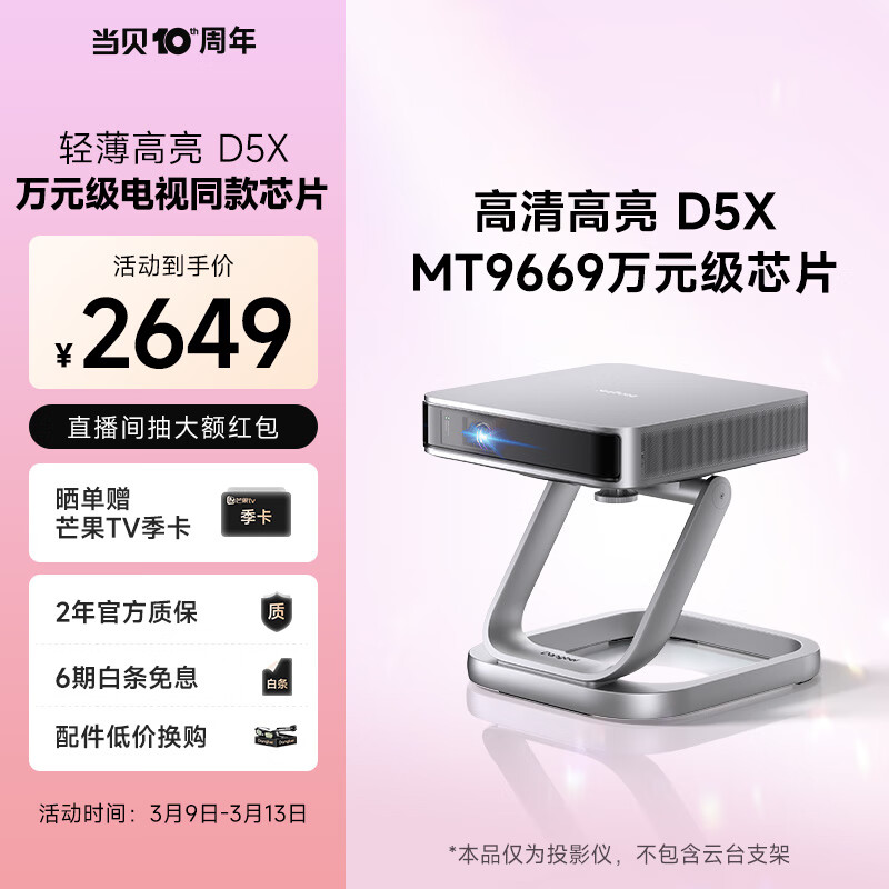 当贝 D5X 投影仪家用 投影机 轻奢家庭影院(轻薄旗舰 MT9669万元级芯片 超清高亮 梯形校正)价格:2649.00元!