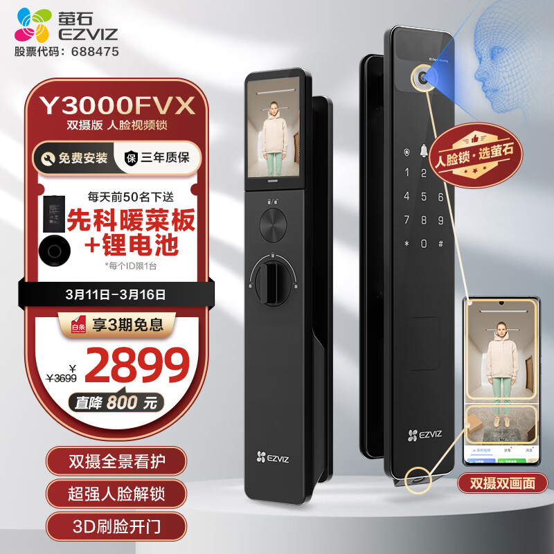 萤石Y3000FVX智能锁 静谧黑 3D人脸识别无需指纹 双摄双画面可视 家用全自动智能猫眼门铃防盗视频锁价格:2899.00元!
