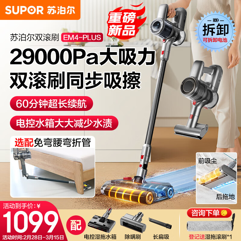 苏泊尔(SUPOR)手持无线吸尘器29kpa大吸力家用洗地机吸拖一体60分钟长续航除螨仪宠物吸猫毛EM4 PLUS价格:1099.00元!