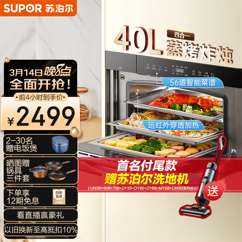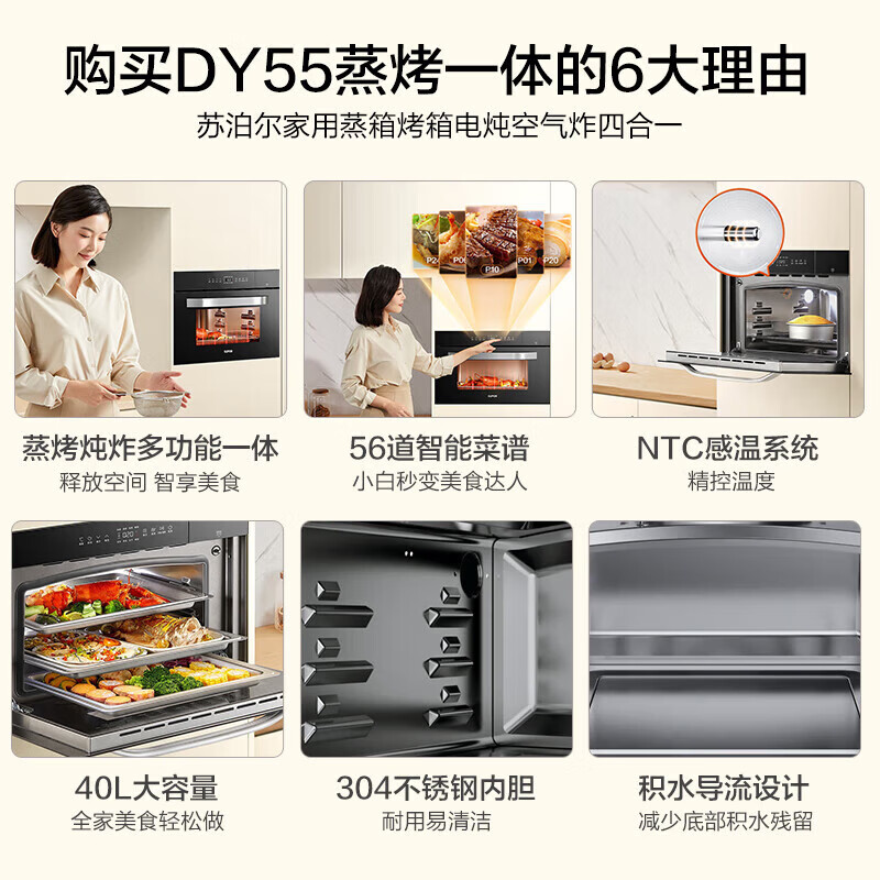 苏泊尔(SUPOR)嵌入式蒸烤箱一体机家用蒸箱烤箱电炖空气炸4合1 40L大容量56道智能菜单DY55蒸烤箱价格:2698.00元!