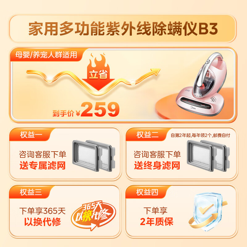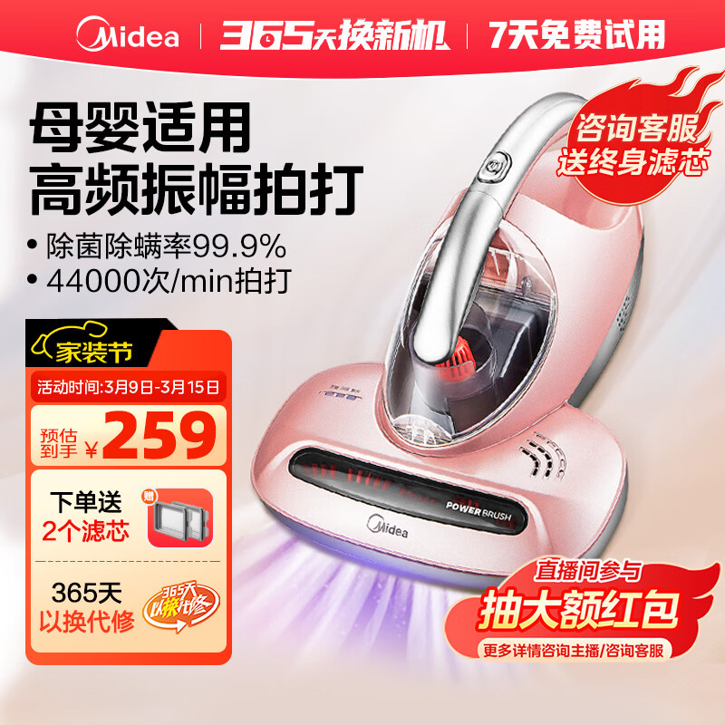 美的(Midea)除螨仪家用 紫外线除螨杀菌 床上手持吸尘 50℃热风除湿 B3价格:259.00元!