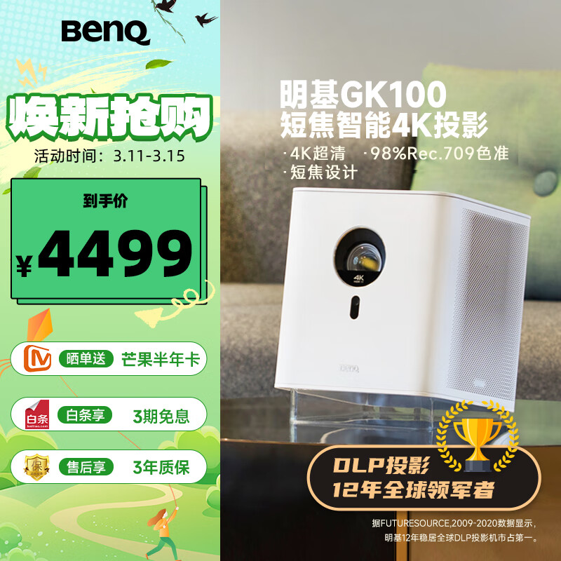 明基(BenQ)【4K性价比之选】GK100 智能美学4K电影机 投影仪家用(自动对焦 梯形校正 MEMC HDR10)价格:4499.00元!