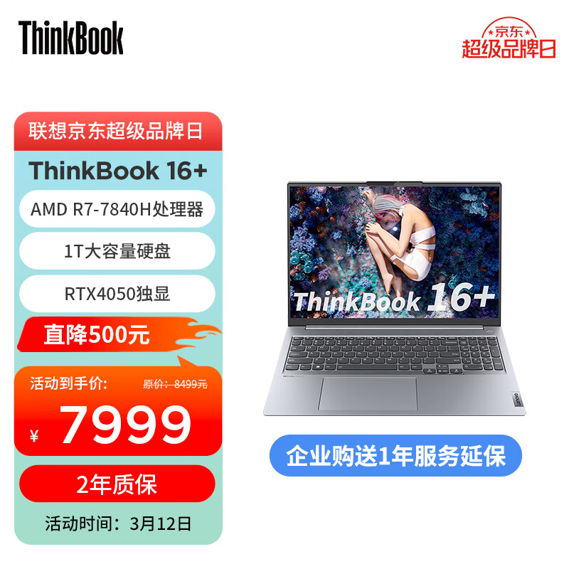 ThinkPad联想笔记本电脑ThinkBook 16+ 锐龙版 16英寸便携轻薄办公本R7-7840H 32G 1T RTX4050 2.5K 120Hz价格:7999.00元!