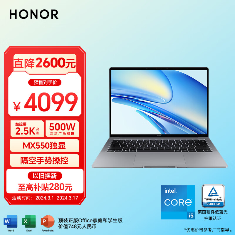 荣耀MagicBook V 14 12代酷睿标压i5-12500H 16G 512G MX550 2.5K高刷触控 14吋商务轻薄笔记本电脑价格:4099.00元!