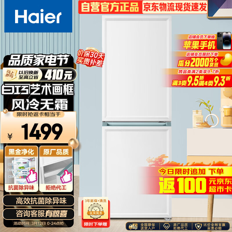 海尔(Haier)白巧系列200升两门二门双开门小户型家用电冰箱节能风冷无霜租房宿舍以旧换新BCD-200WGHC290WV价格:1599.00元!