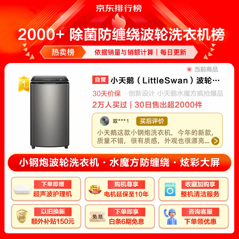 小天鹅波轮洗衣机全自动 小钢炮【TB100V83PLUS】水魔方防缠绕 水动银99%除菌 直驱变频 炫彩大屏 10公斤价格:2397.00元!