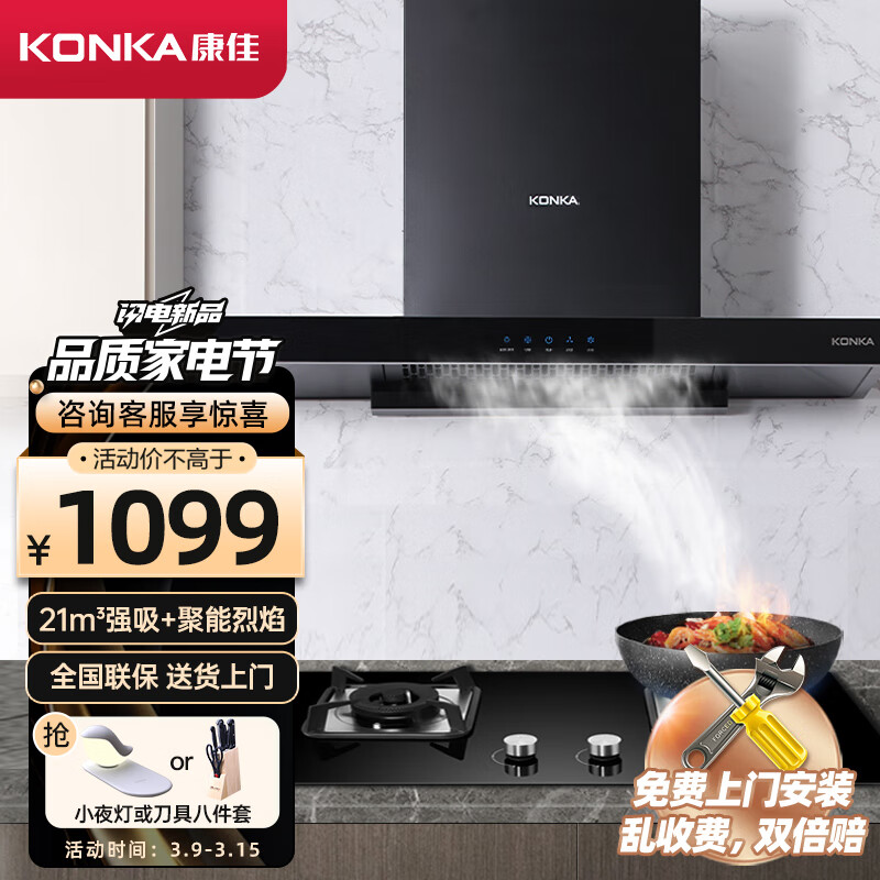 康佳(KONKA)抽油烟机燃气灶具套装 家用欧式21m3/min大吸力挥手自清洗烟灶两件套装 KT55+B500F(天然气)价格:1097.00元!