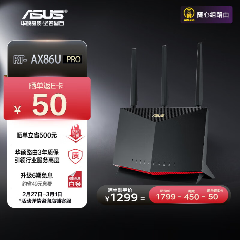 华硕(ASUS)RT-AX86U Pro双频5700M全千兆电竞路由器/wifi6无线路由千兆穿墙/Ai路由器/金榜路由价格:1799.00元!