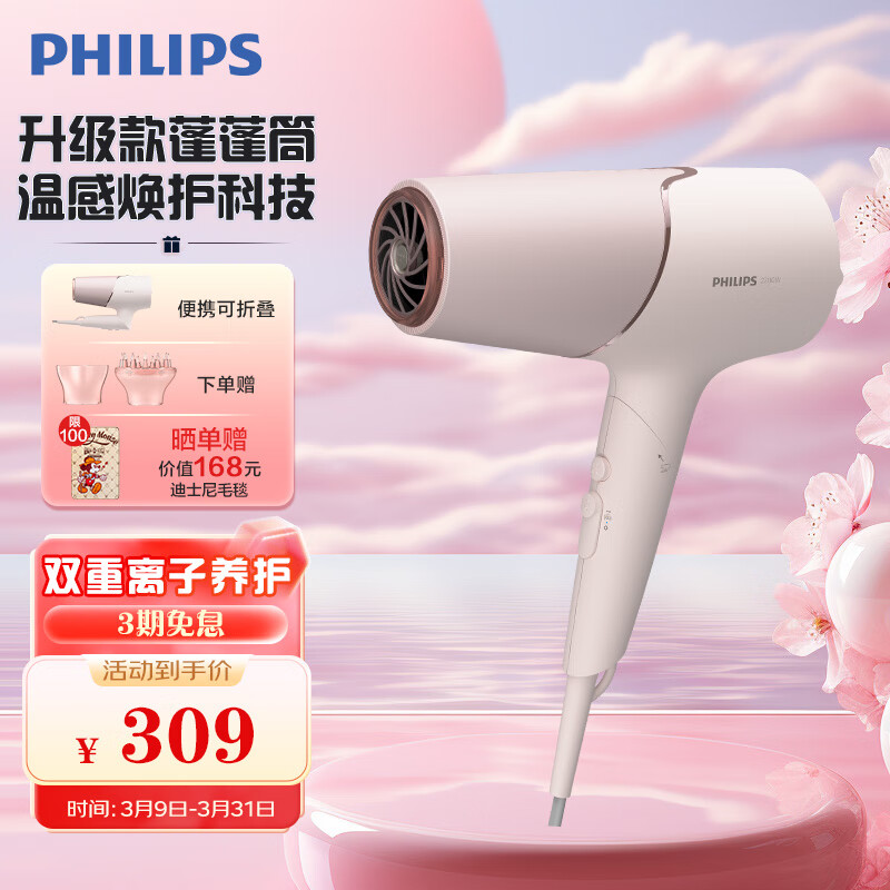 飞利浦(PHILIPS)电吹风机 5系 蓬蓬筒pro 温感焕护4千万负离子 矿物质锌离子 大功率速干 柔漾粉价格:309.00元!