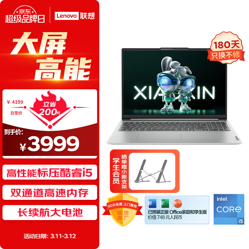 联想联想笔记本电脑小新16 英特尔酷睿标压i5 16英寸轻薄本 16G 512G护眼屏 商务办公学生价格:3999.00元!