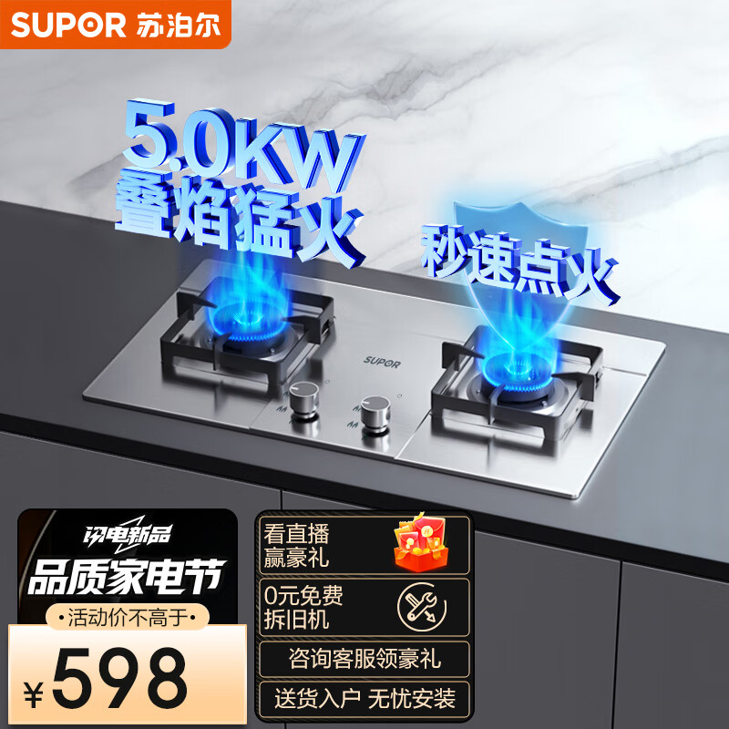 苏泊尔(SUPOR) 燃气灶双灶 液化气灶双灶具5.0kW家用猛火灶台 不锈钢面板台嵌两用 点火即燃 S16液化气价格:598.00元!