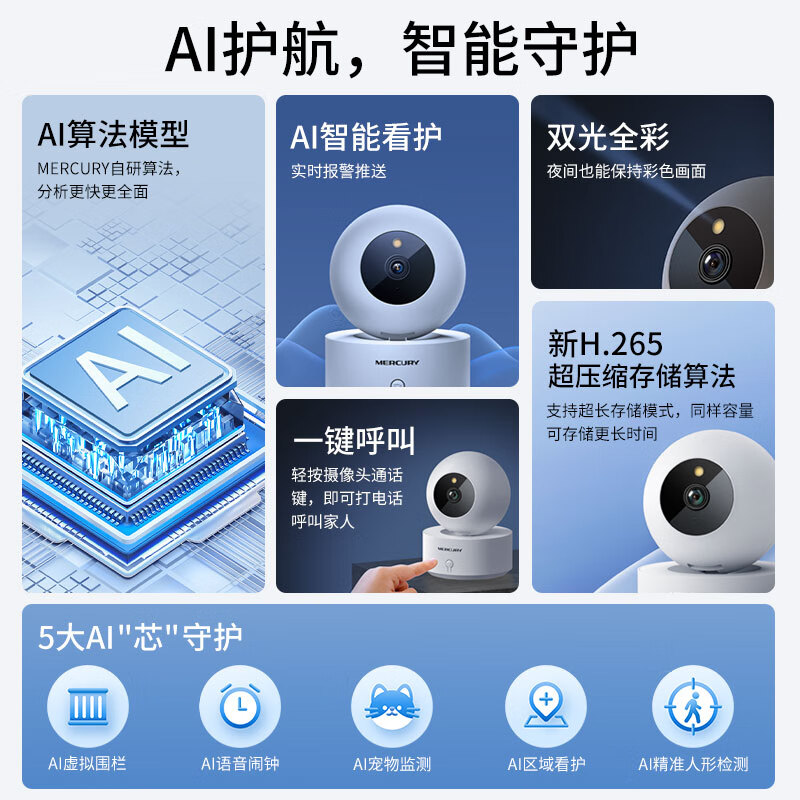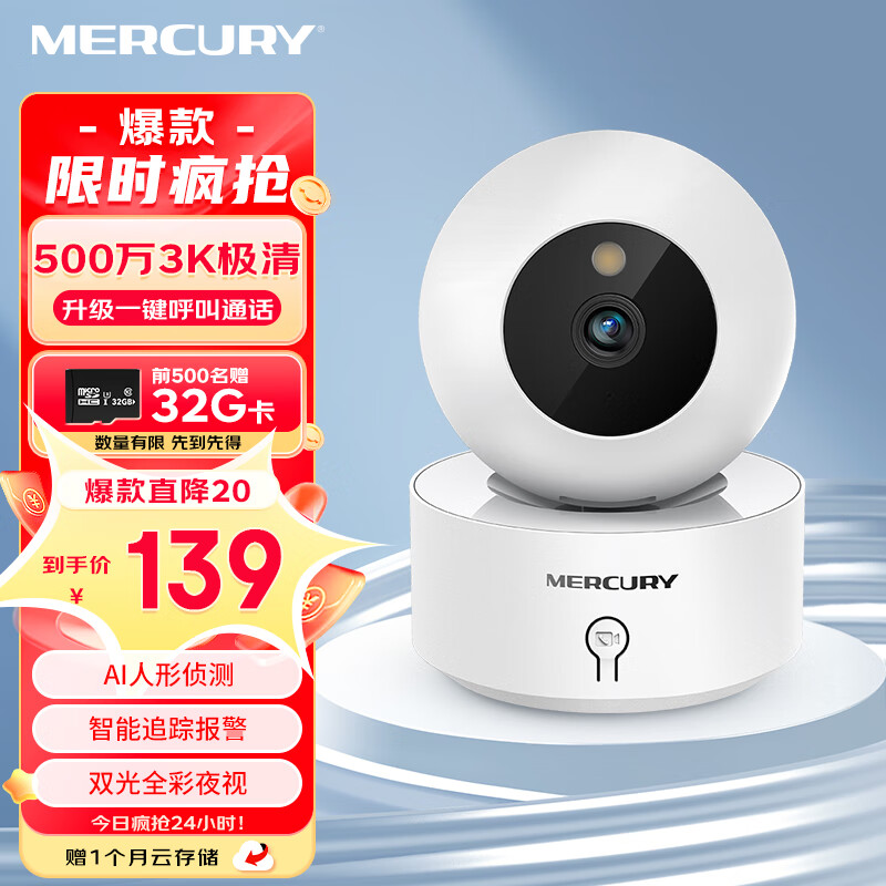 水星(MERCURY)500万监控室内摄像头无线智能云台wifi手机远程对讲360度全景家用监控器婴儿看护器宝宝监护价格:139.00元!