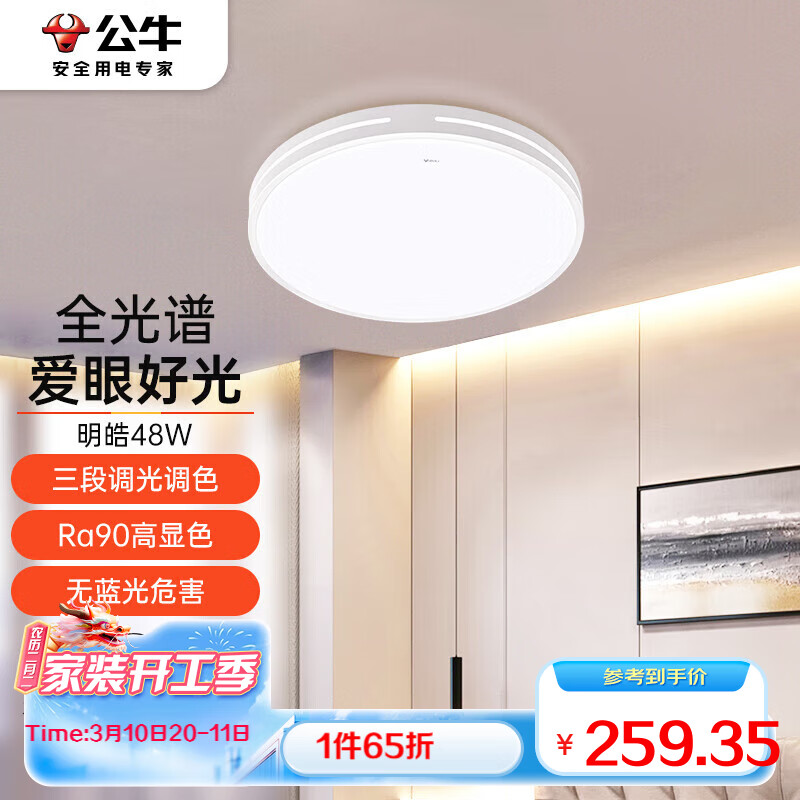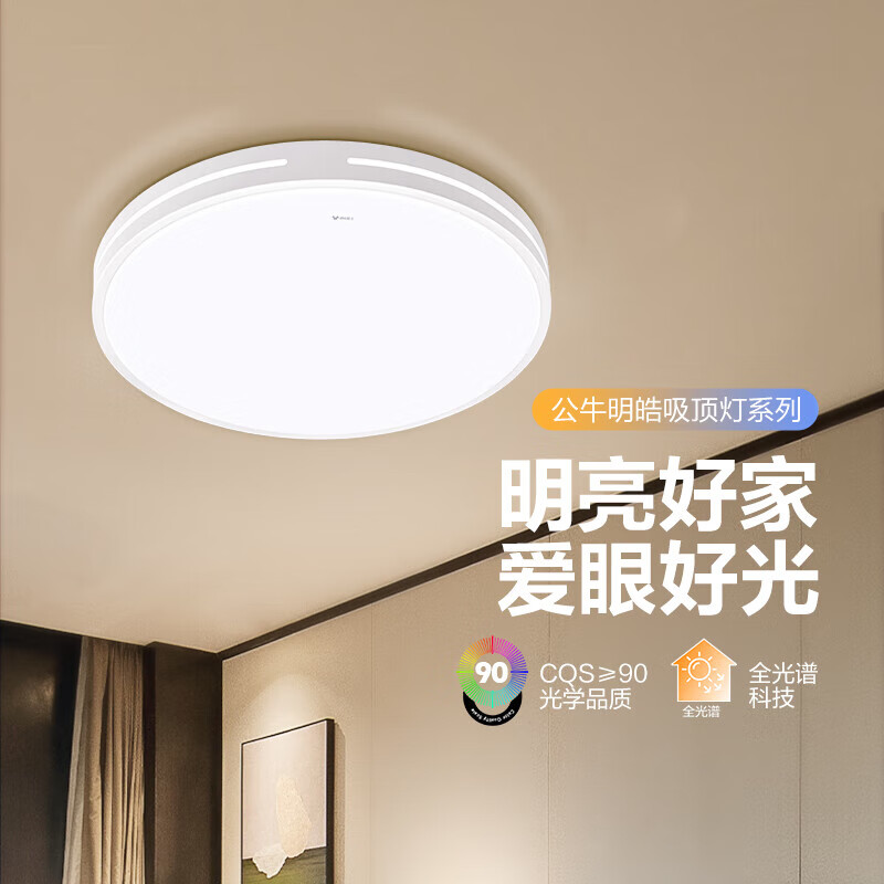 公牛(BULL)吸顶灯全光谱MX-B048E-CS明皓卧室灯北欧现代简约圆形三段调光48W价格:399.00元!