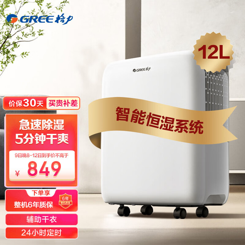 格力(GREE)抽湿机/除湿机 除湿量12升/天 家用轻音卧室办公室地下室低噪干衣除湿器长效定时 (DH12EN)价格:849.00元!