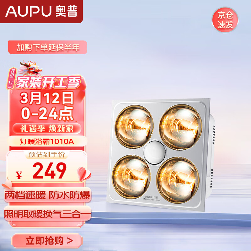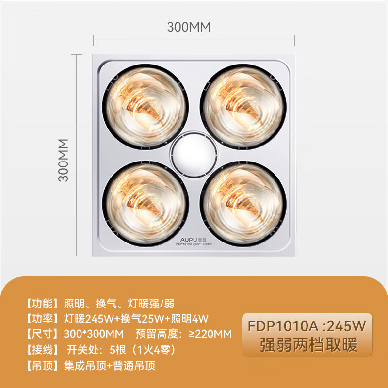 奥普 灯暖浴霸1010A浴室卫生间多功能取暖照明集成吊顶普通吊顶适用价格:319.00元!