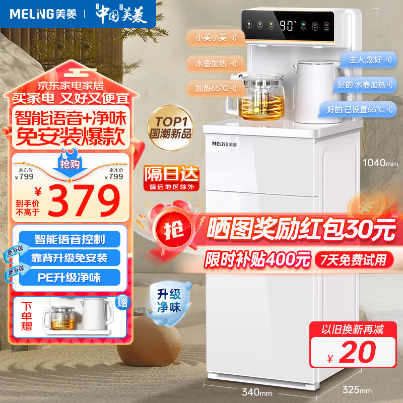 美菱(MeiLing)智能语音茶吧机饮水机遥控大屏下置式 YT931【语音控制+免安装靠背+高颜值+升级净味管】价格:379.00元!