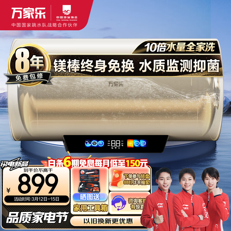 万家乐80升电热水器智能巡航水质监测杀菌 镁棒免换 3000W速热 一级能效 10倍大水量D80-FD5价格:1099.00元!