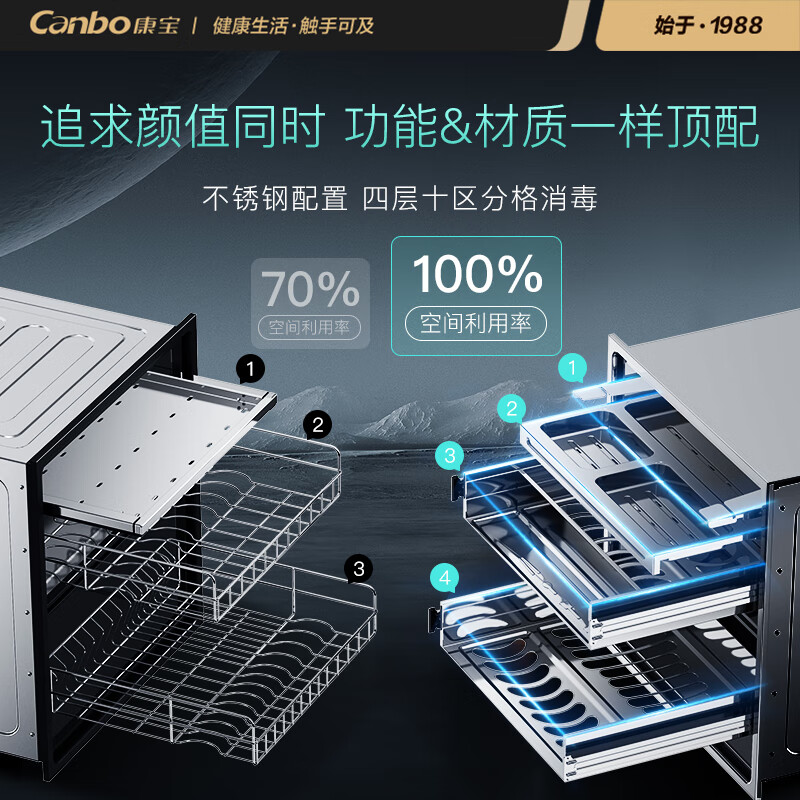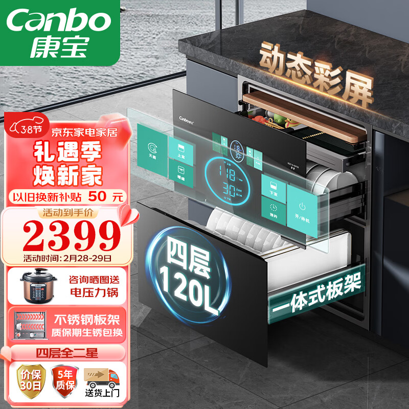 康宝(Canbo)120L四层不锈钢星幕磐石 消毒柜嵌入式家用高温二星厨房餐具碗筷砧板紫外线消毒碗柜XDZ120-EN720价格:2399.00元!