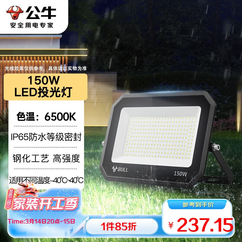 公牛(BULL)LED投光灯户外庭院工厂园林灯露营灯 IP65防水等级150W-6500K白光价格:279.00元!