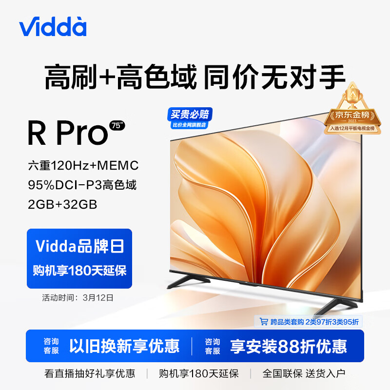 Vidda R75 Pro 海信 75英寸 120Hz高刷 2+32G 超薄屏 智慧屏 游戏液晶巨幕电视以旧换新75V1K-R价格:2798.00元!