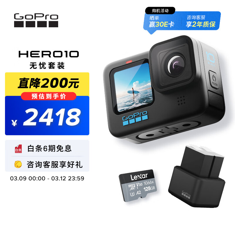 GoPro HERO10 Black防抖运动相机 增强续航摄像机 防水相机 vlog潜水滑雪摄影摄像 无忧套装价格:2118.00元!